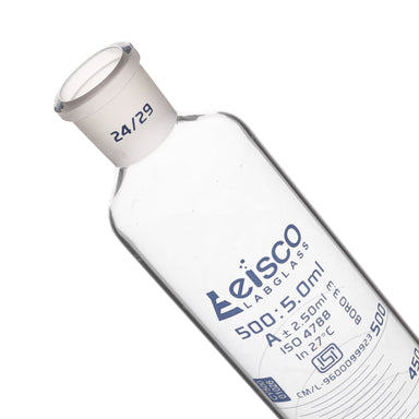Class B borosilicate 3.3 volumetric flask Includes polyethylene (PE) stopper, size 24/29 Single etched graduation mark, blue print Tolerance ±0.80...
