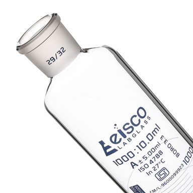 Class B borosilicate 3.3 volumetric flask Includes polyethylene (PE) stopper, size 34/35 Single etched graduation mark, blue print Tolerance ±2.40...