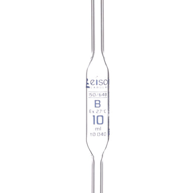 Pipette class 'B' 10ml, Borosilicate glass, Blue Printing bulb form, Red ISI
